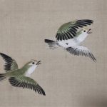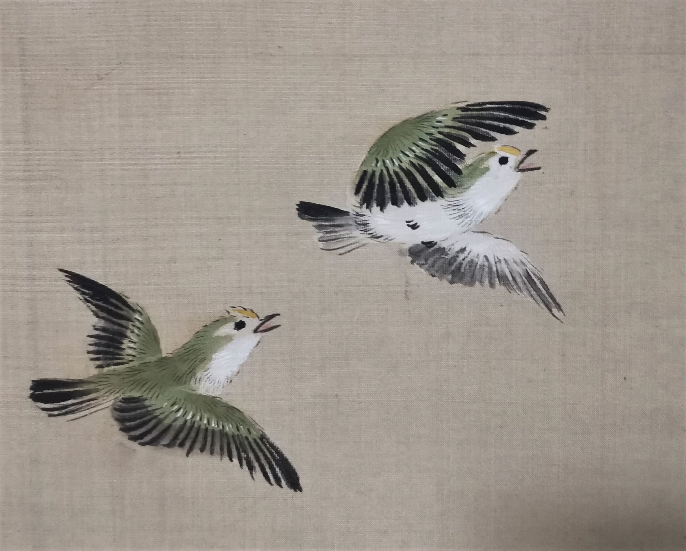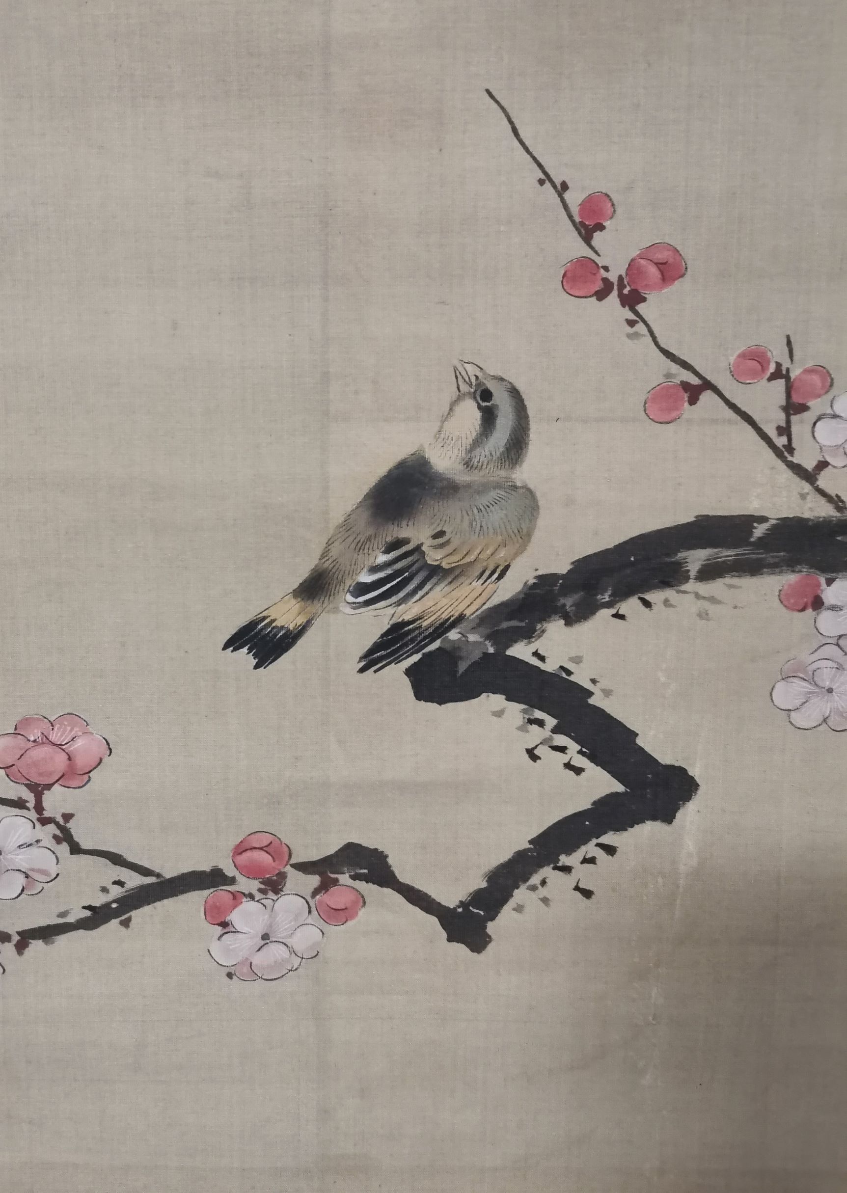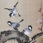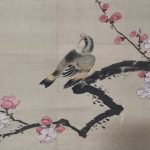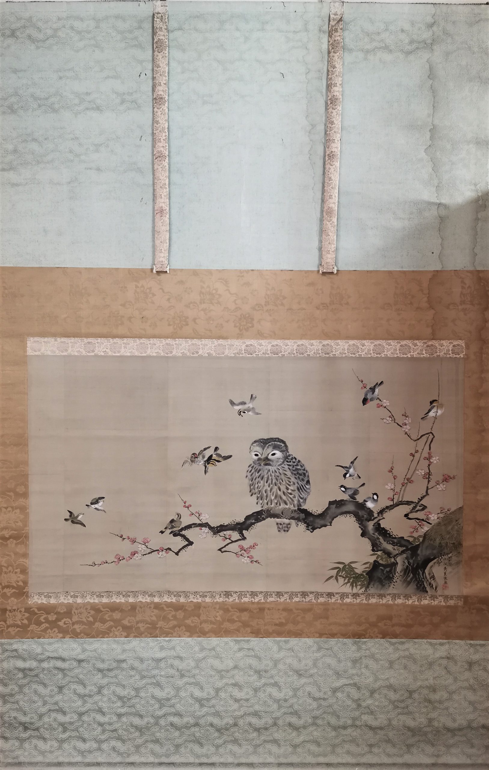 If you look closely at the ends of the zigzag flexing branches, you will see that some of them are still in bud. These plum blossoms are probably just beginning to bloom. The patterns of the birds are colored in gentle tones, and the fur of them is expressed by fine brush strokes throughout the work. On the other hand, the owl, which is resting its wings without a care in the world, has a plump, round silhouette that gives it a distinctive presence. The beak and whiskers are also faithfully depicted.