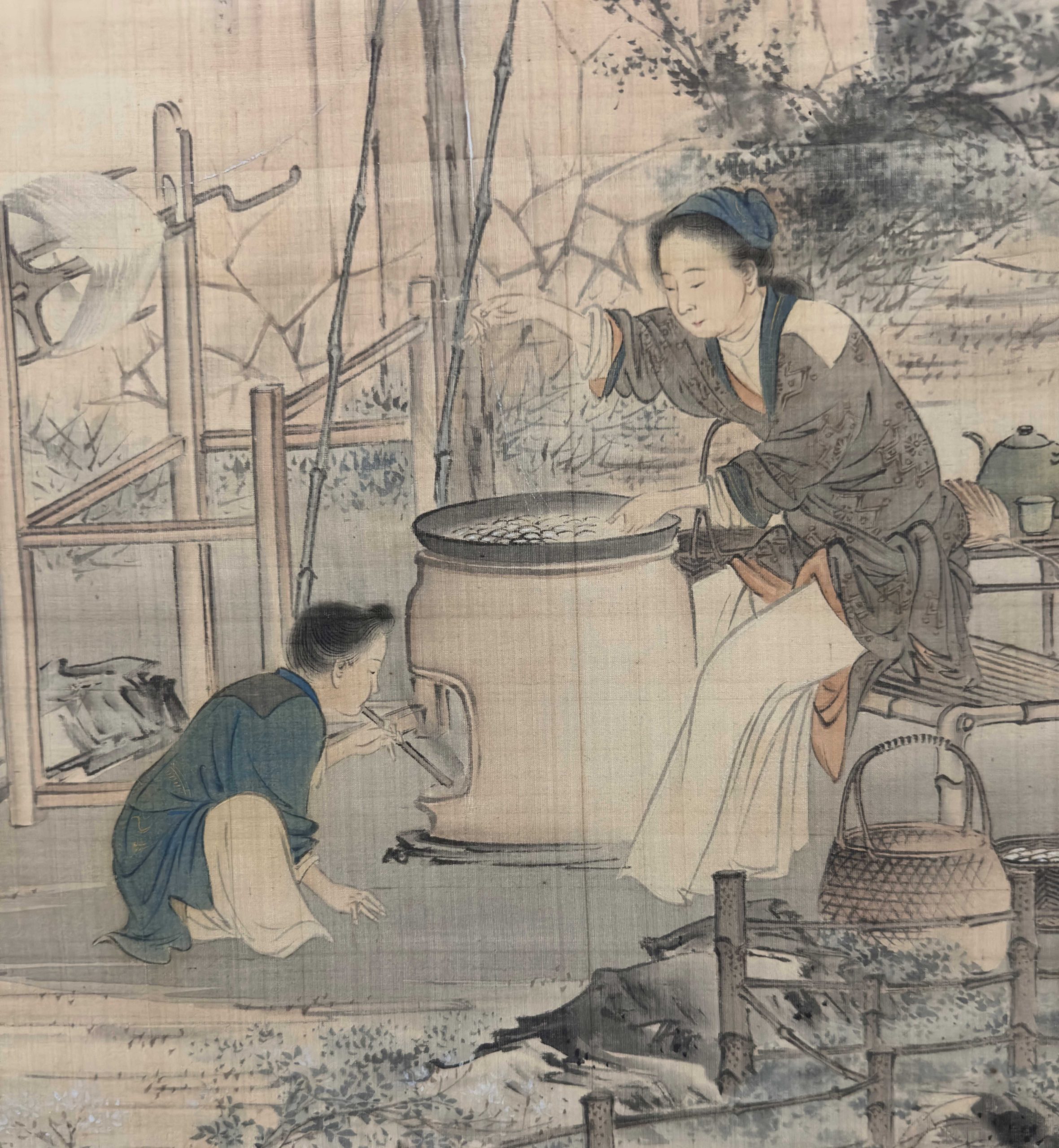 A Chinese-style woman and a boy are single-mindedly boiling cocoons and spinning silk thread.