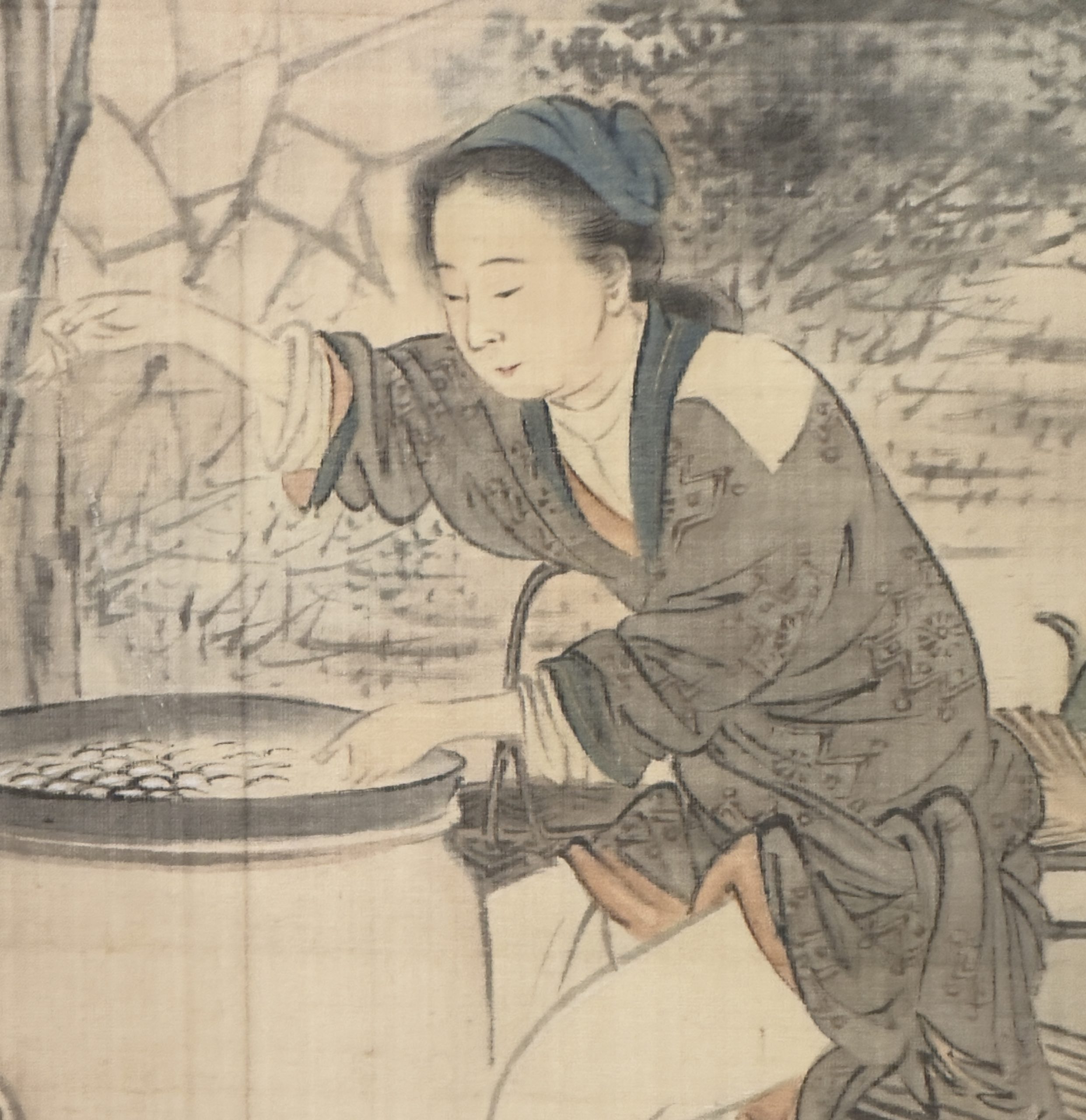 An example of a work very similar to this one is “Silkworms” (Kansai University Museum) by his son, Kanei Nishiyama. The two works are perfectly matched in every detail, not only in composition, but also in the way the figures and scenery are depicted, indicating that Kanei respected his father and tried to make his painting techniques his own. They are a glimpse of the strong bond between father and son as well as master and disciple.