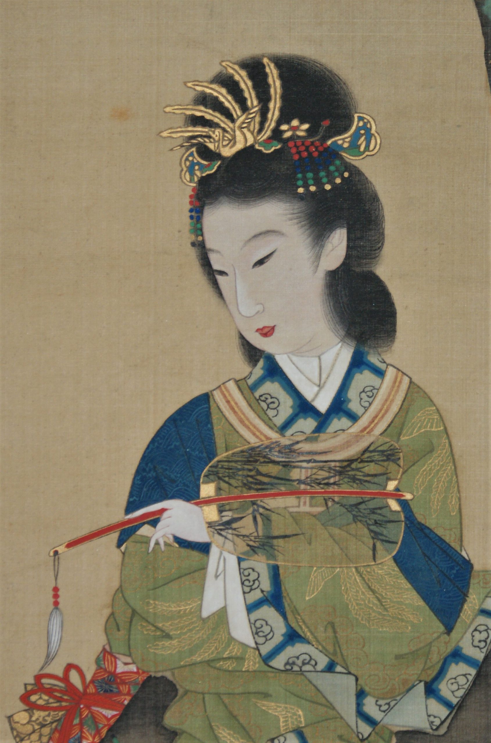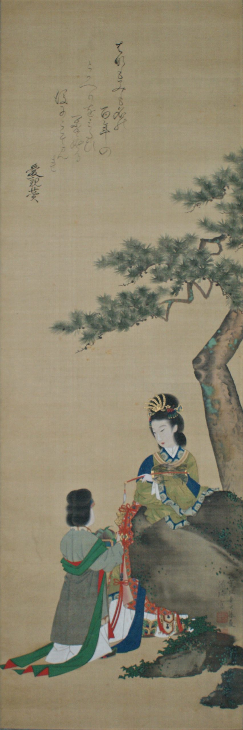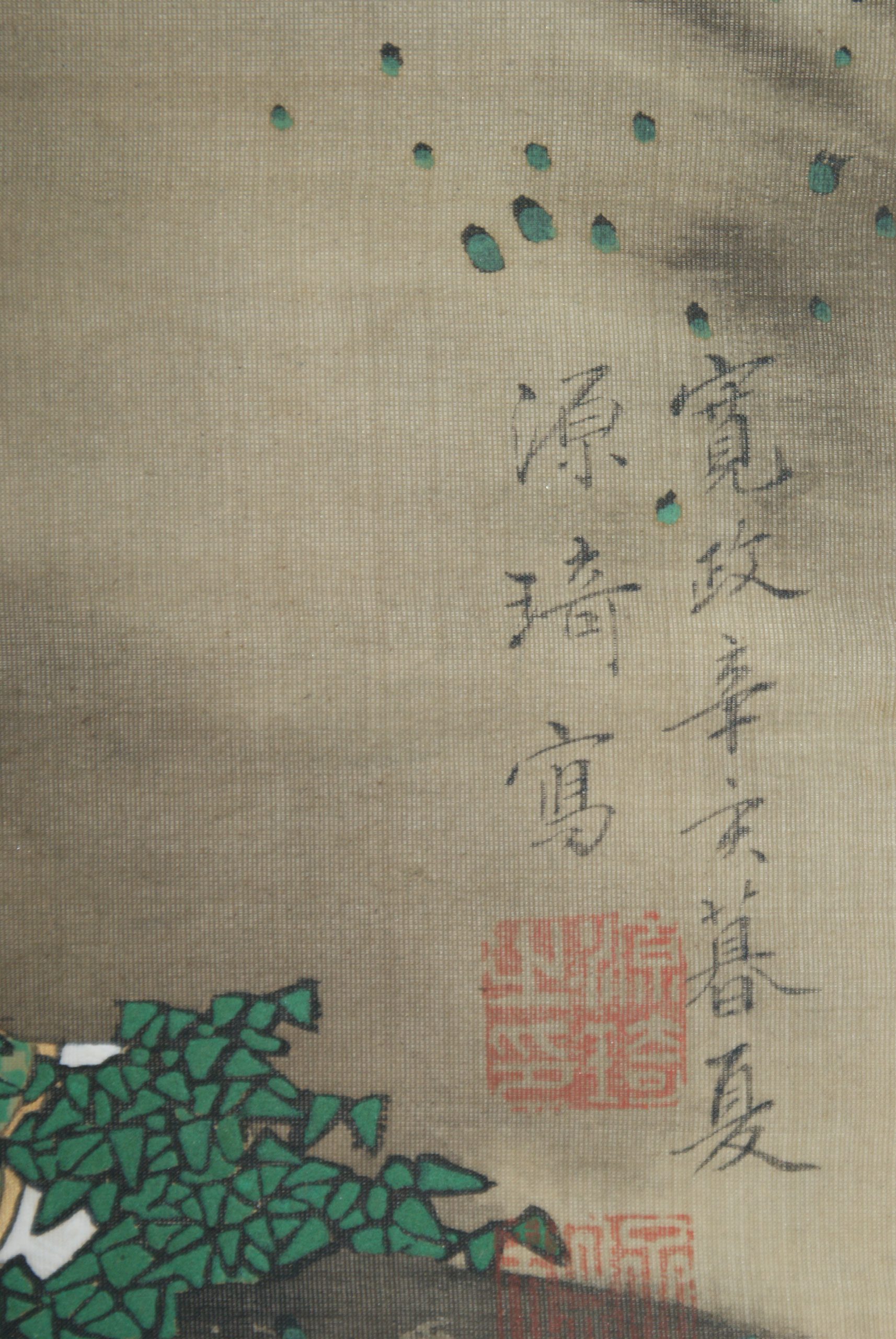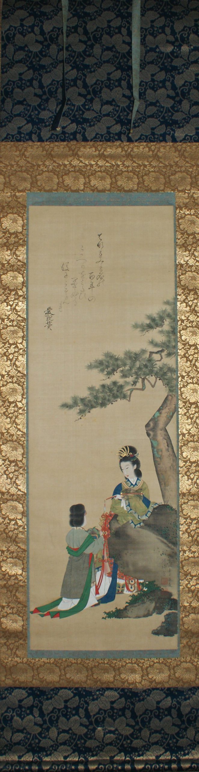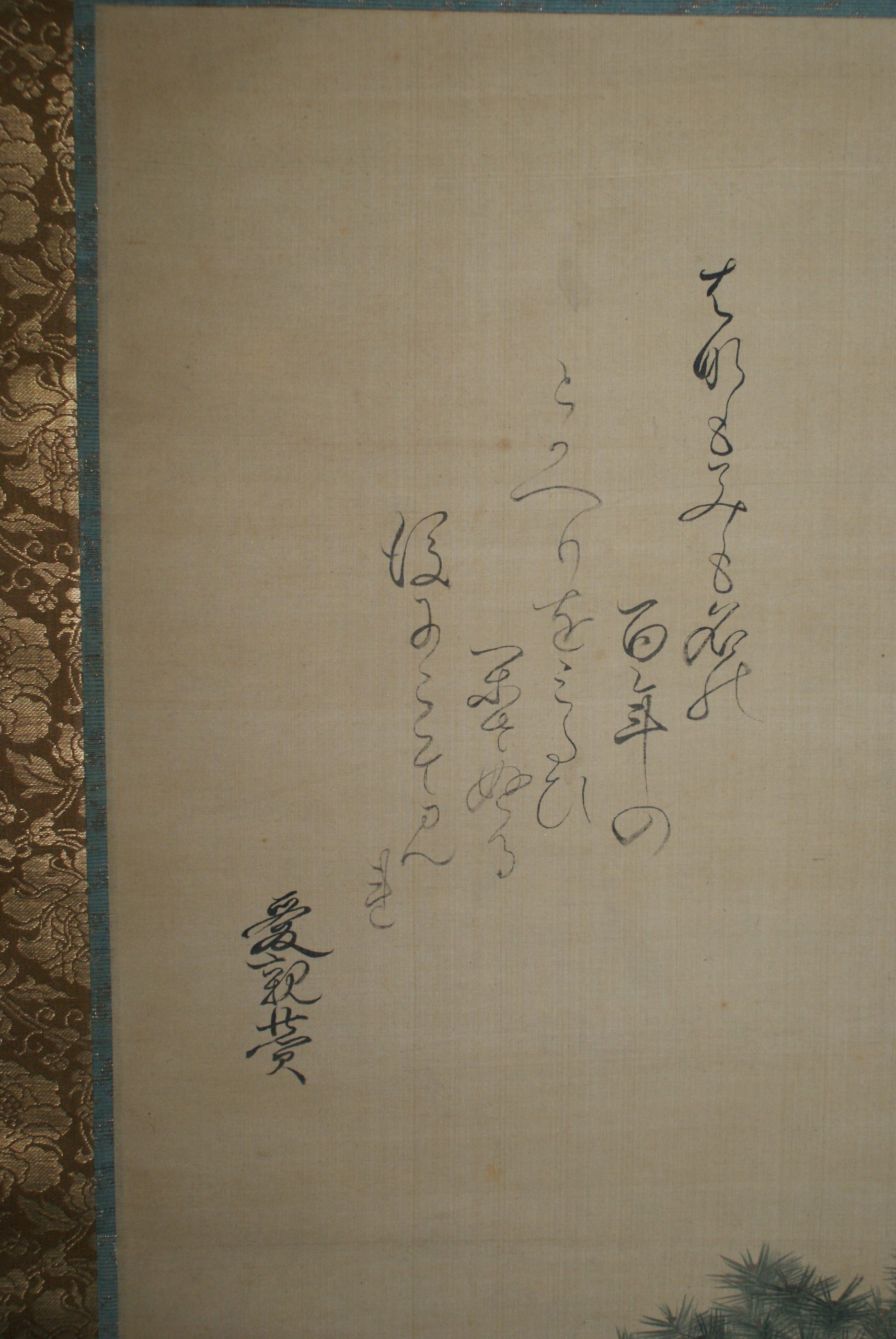 Genki (1747-1797) was a painter active in Kyoto in the mid-Edo period. At the time, he was famous as a first-rate painter along with Ito Jakuchu and Ike Taiga. He studied painting under Maruyama Okyo, and his works follow the style of Okyo. The “愛親” of the admirer is thought to be Naruchika Nakayama (1741-1814), a court noble of the mid-to-late Edo period.