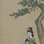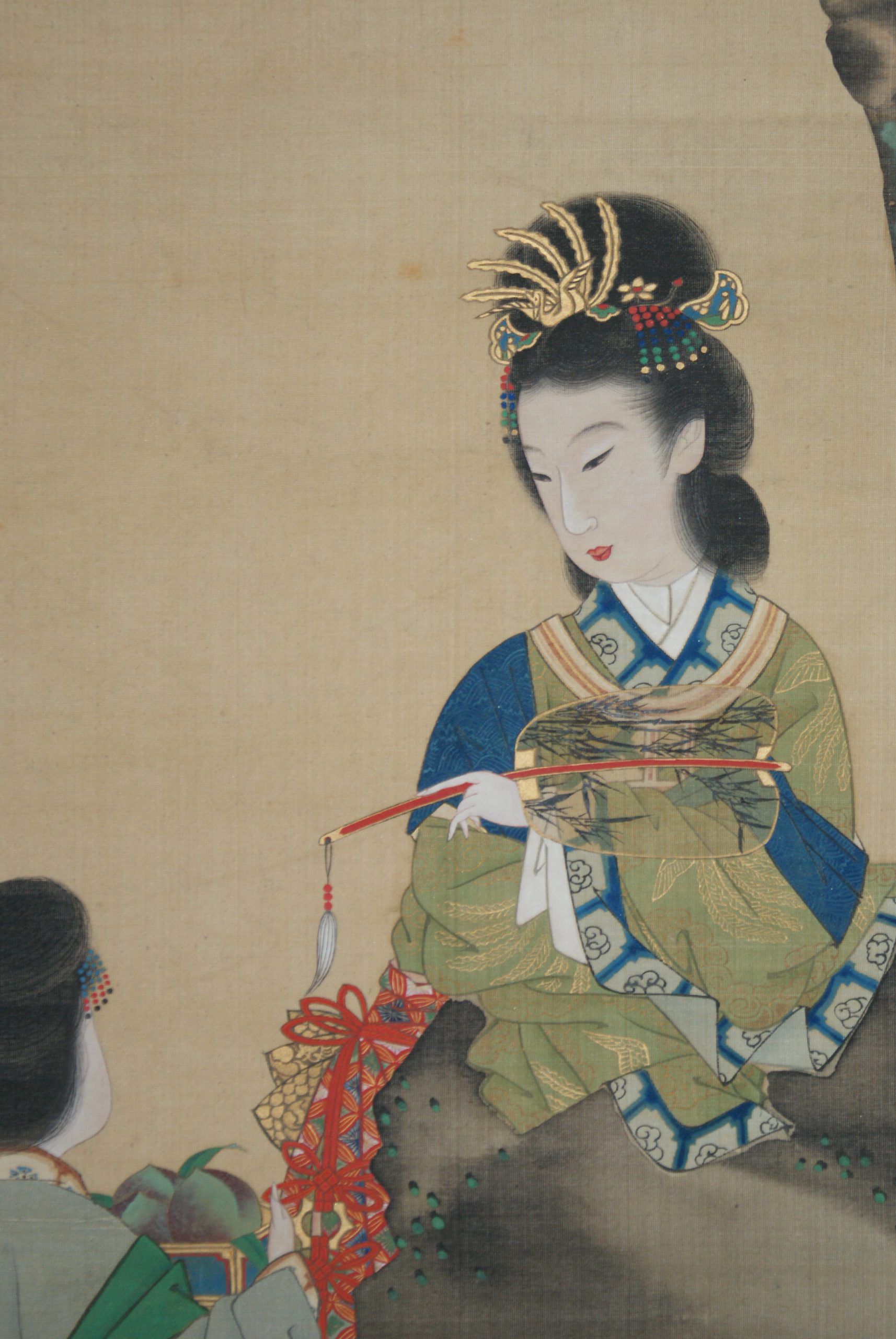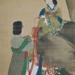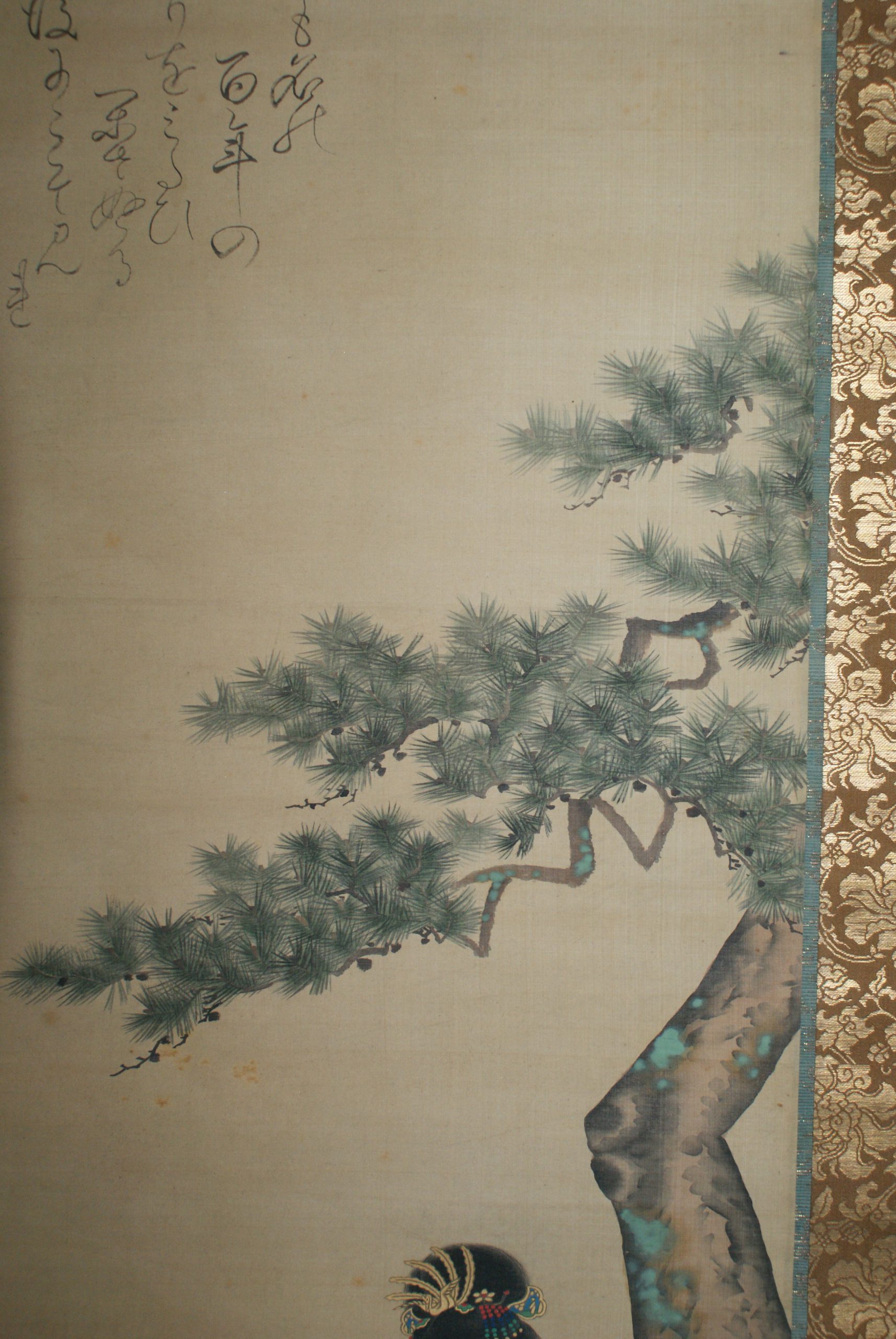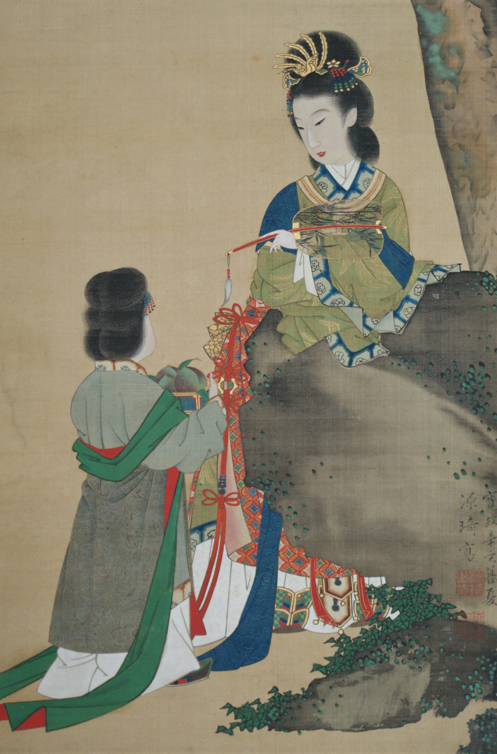 Xiwangmu is a hermit who lives in the legendary Kunlun Mountains in the west and has a peach tree that bears fruit once every 3,000 years. It is said that if one eats the fruit, he or she will have a long life. In this painting, Xiwangmu is leaning against a rock on the right side of the screen, and a lady attendant is offering peaches to her. The artist’s high skill is evident in the noble, hermit-like expression on Seiohbo’s face and the translucent fan. The waka poem in praise of the painting reads, “Hana momo nama no hyakunen no koheri wo mitahikasanuru kara mieru.”
