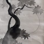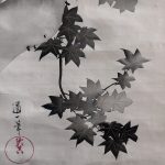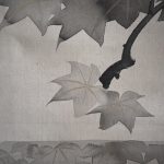 A maple tree stands quietly in the moonlight.The shading of the sumi ink and the “tarashikomi” technique skillfully depict the underside of the leaf and the intensity of the light shining on it.The gold mud used on the veins of the leaves adds an accent to the ink-only color of the painting.The entire background is painted in very light sumi ink, and the light of the full moon is expressed by the remaining sumi ink.