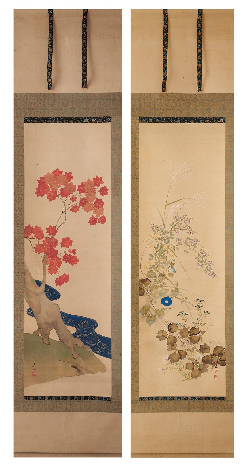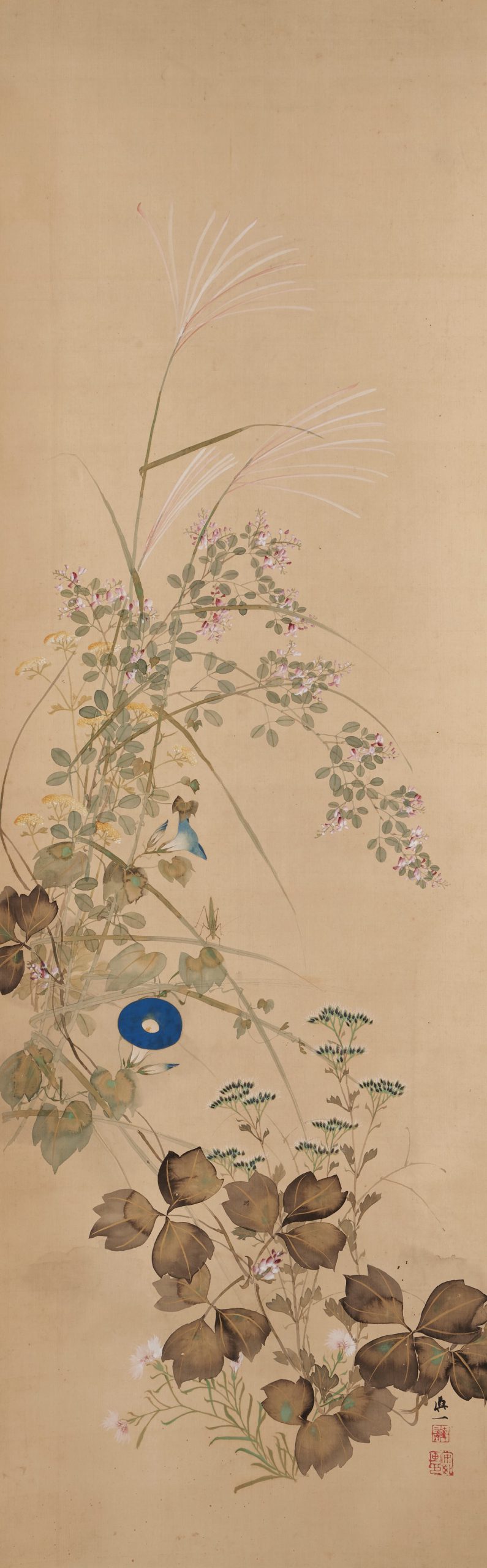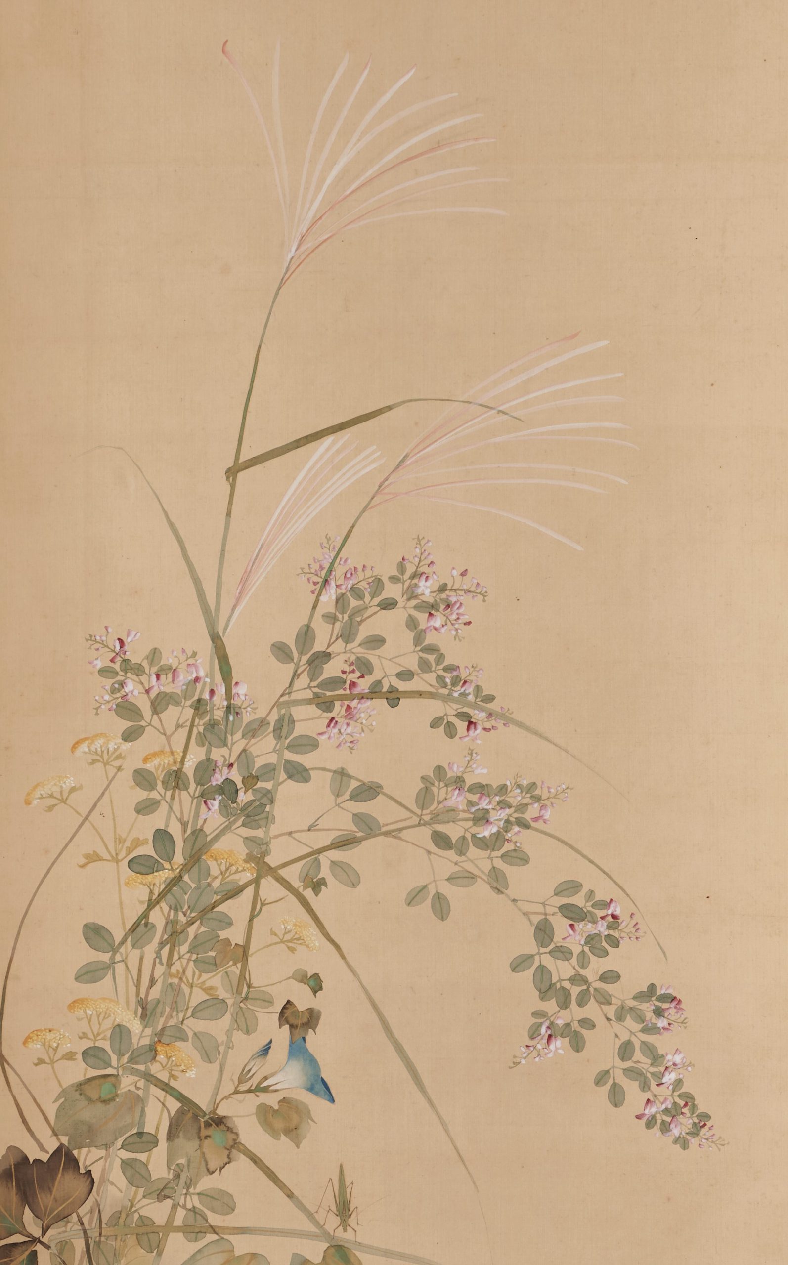 The right side of the scroll depicts the seven flowers of autumn, named after the poem “萩の花 尾花葛花 なでしこが花 をみなへし また藤袴 朝顔が花(Hagi no hana obana kuzubana nadeshiko ga hana wominaeshi mata fujibakama asagao ga hana)” by Yamanoue no Okura, which is included in the Manyoshu. The highlight is the “tarashikomi” technique used for the leaves. Lovely insects are also depicted on the leaves of silver grass.