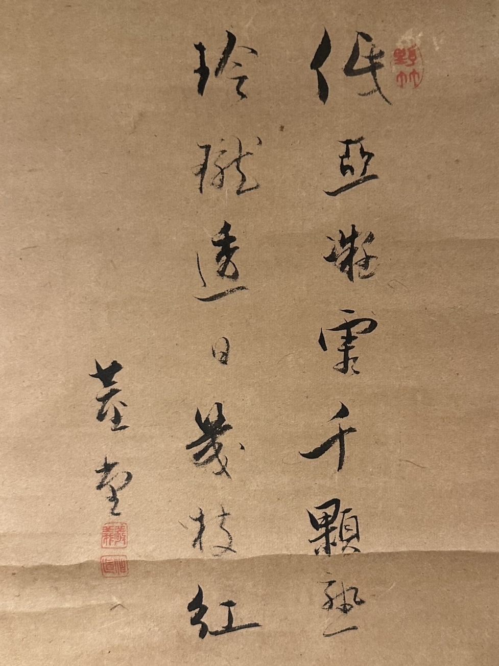 The poem is a praise by Nakai Tōdo (1758-1821), a late Edo period poet, who described the ripe persimmons on the low-hanging branches as shining like jade.
