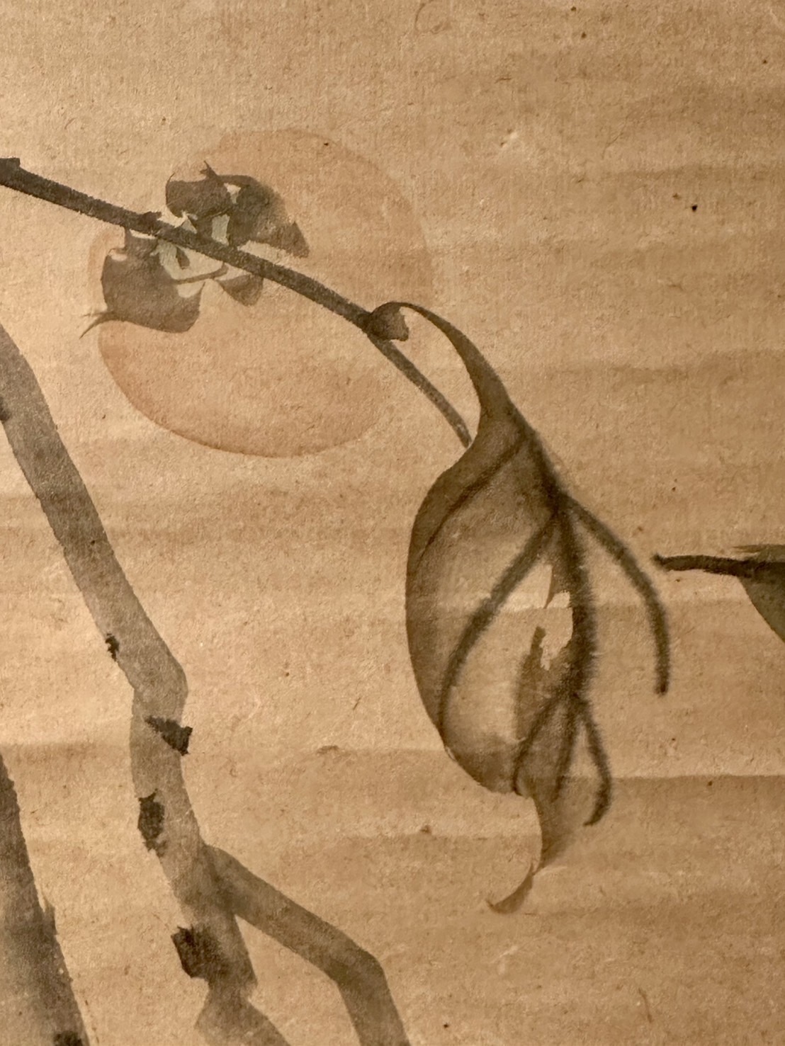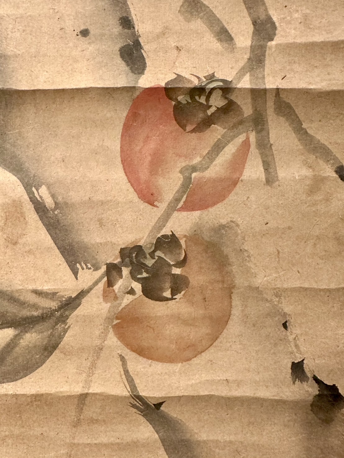 The soft, light colors of the painting make the crimson of the ripe persimmon in the center of the painting look particularly attractive. The artist used a paint with a high moisture content throughout the painting, and employed a variety of techniques, such as “tsuketate” and “tarashikomi”. Despite the small number of strokes, the artist accurately captured the shapes of the branches, leaves, and fruits, and rendered them beautifully.