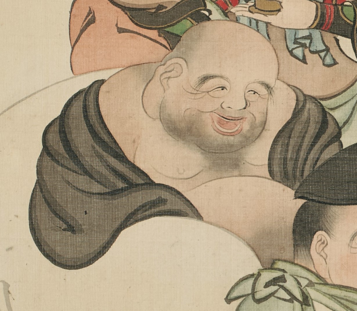 The seven gods of good fortune and cranes are gathered in a circle. Daikoku, Hotei, and Jurojin have open mouths, and the seven appear to be chatting and laughing. The crane is humorously crying to the heavens.