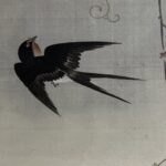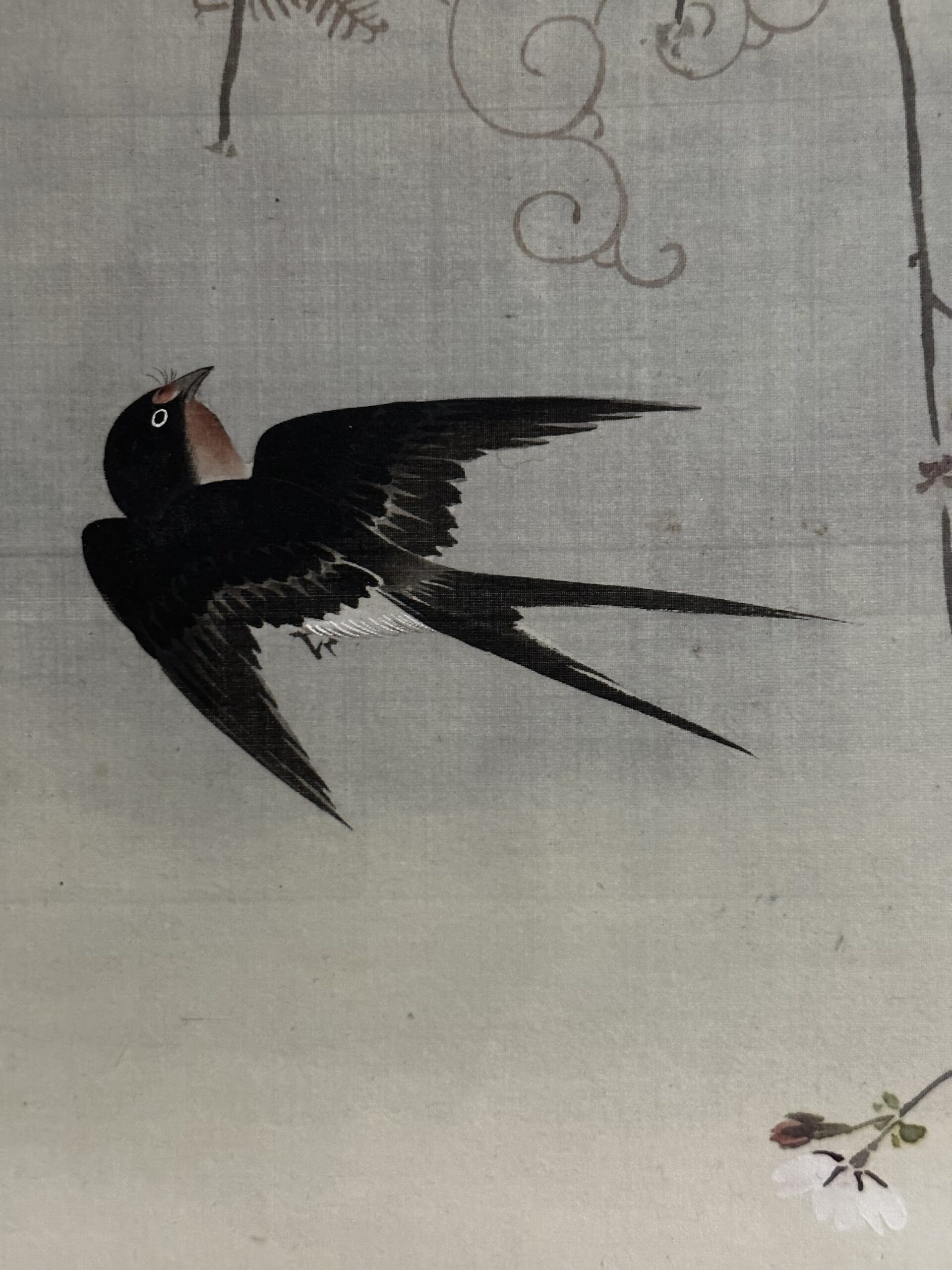 The swallow, depicted in the lower left corner of the painting, has been a familiar bird that heralds the arrival of spring since it flies to Japan in early March.