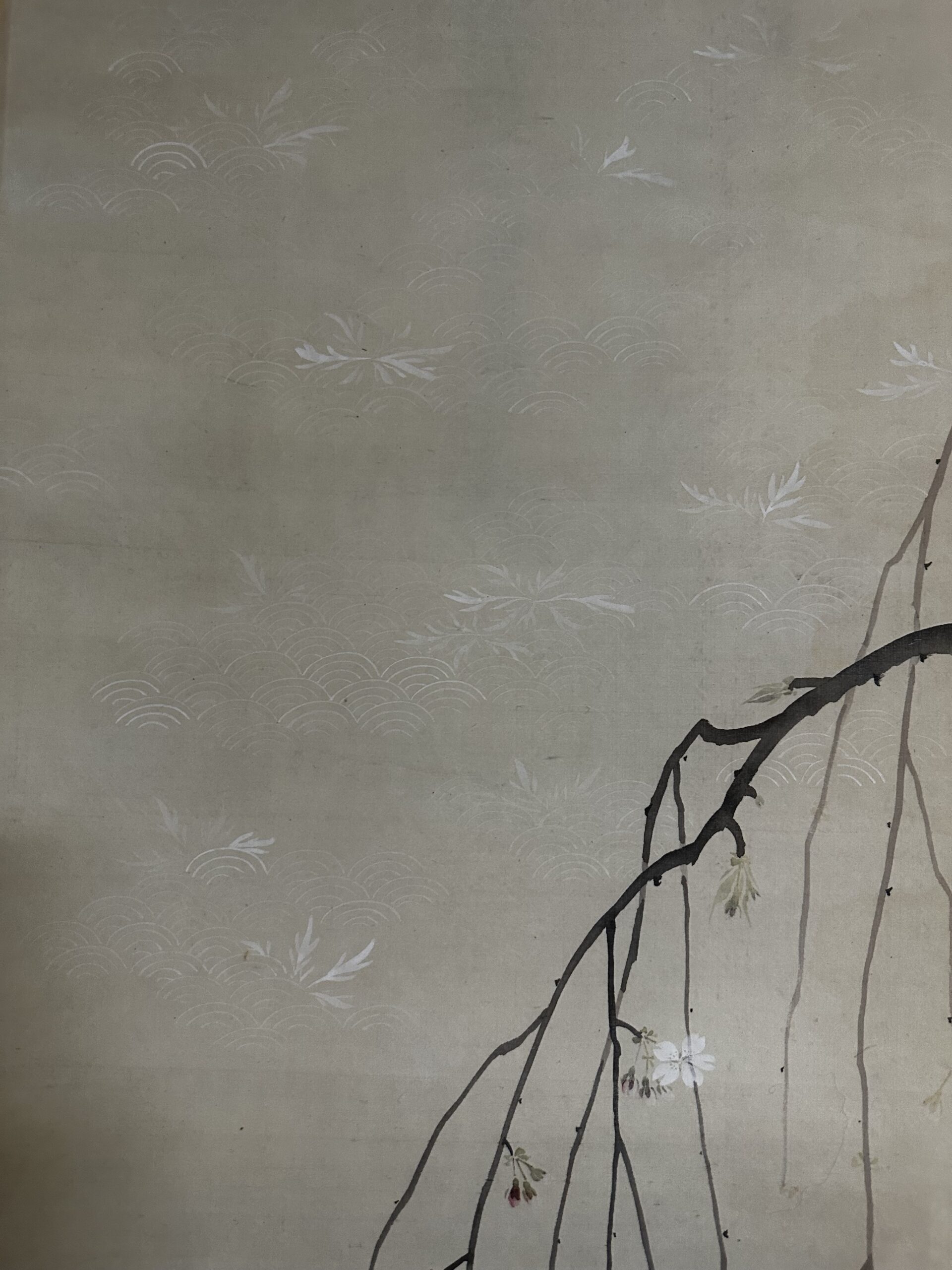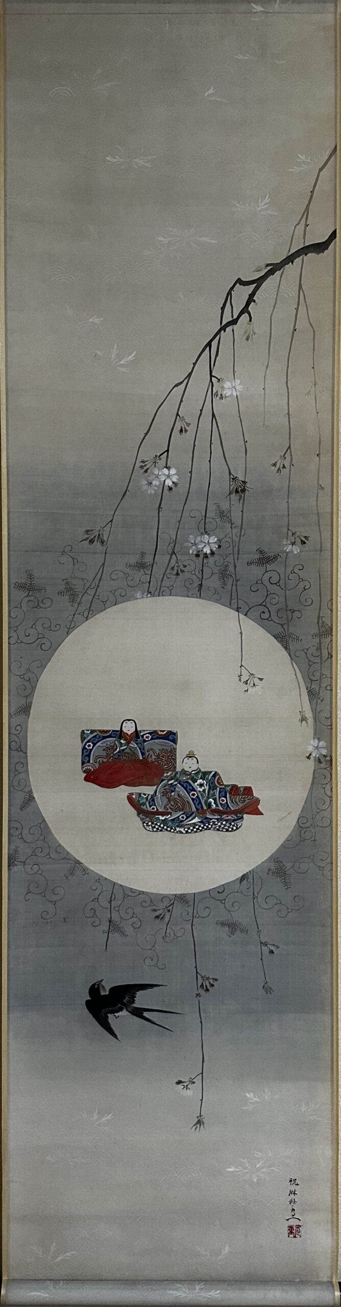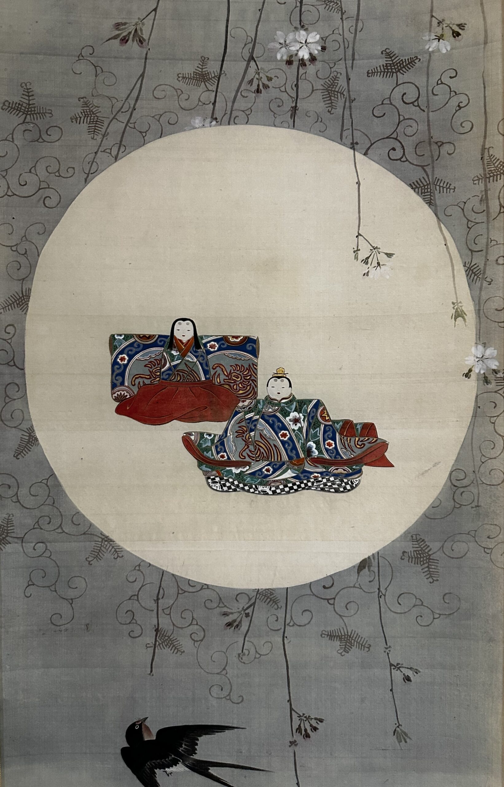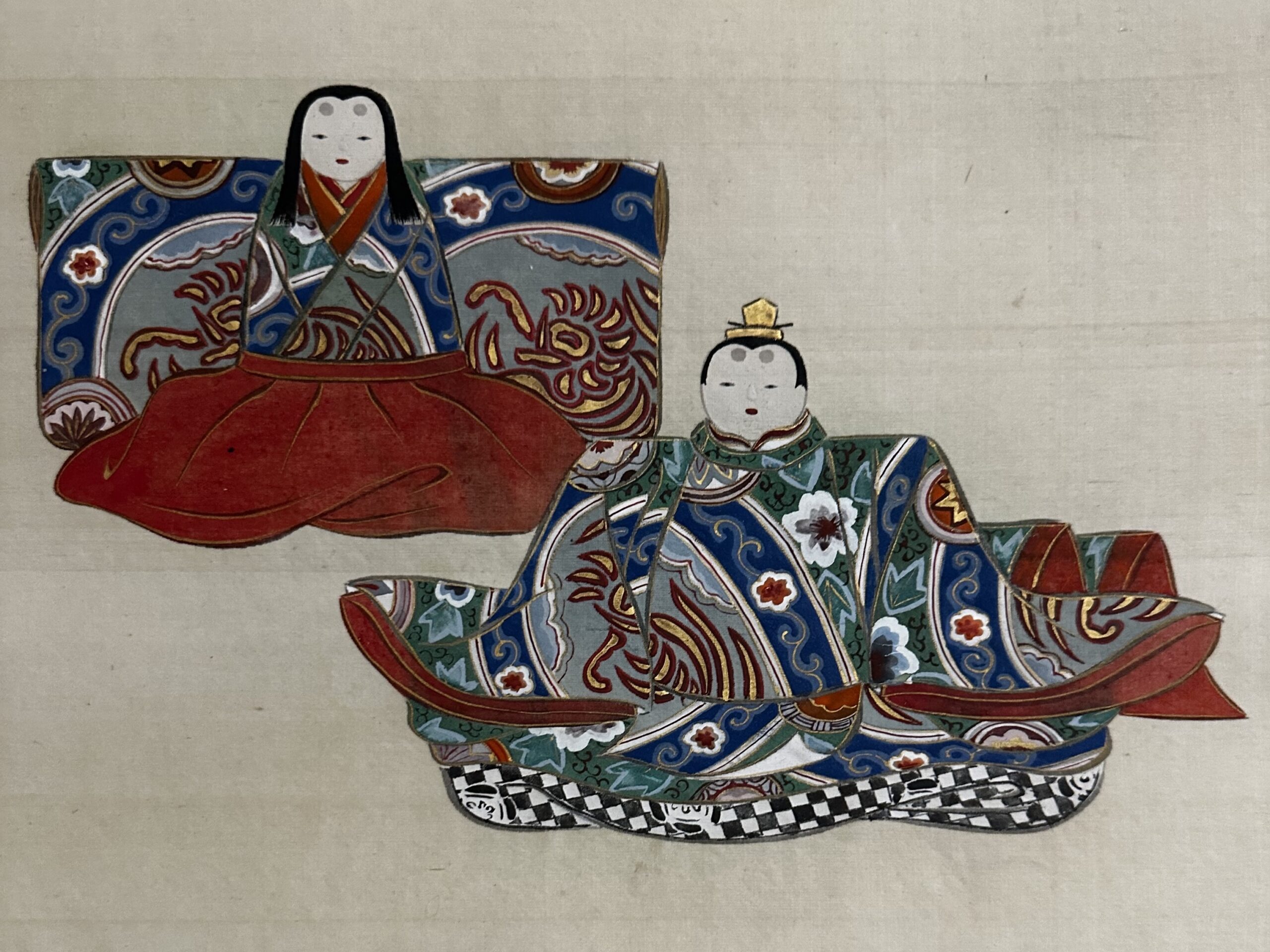 It passes behind the part of the main paper on which the hina dolls are painted, and part of it also hangs down in front of the paper, creating a mysterious pictorial space with depth.