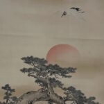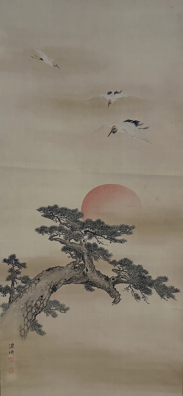 A young pine tree with strong branches. Behind it, the soft morning sun peeks out, and three cranes fly overhead. The artist is Komai Genki (1747-1797), a painter of the Maruyama School in the mid-Edo period.