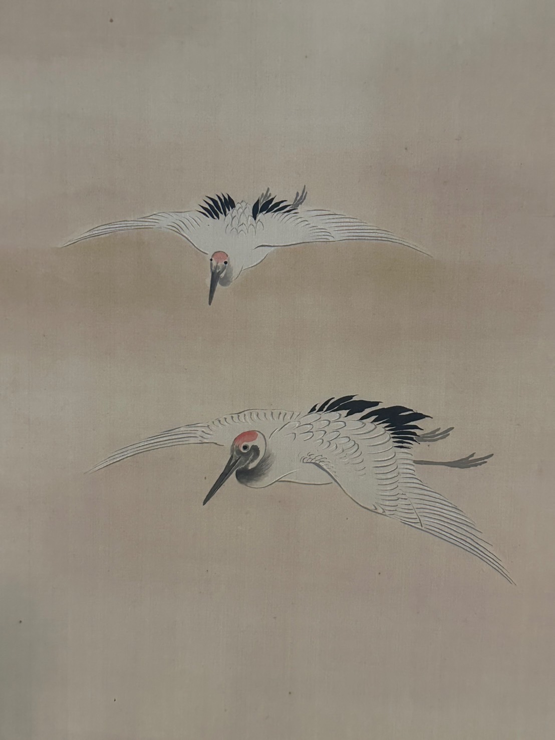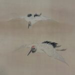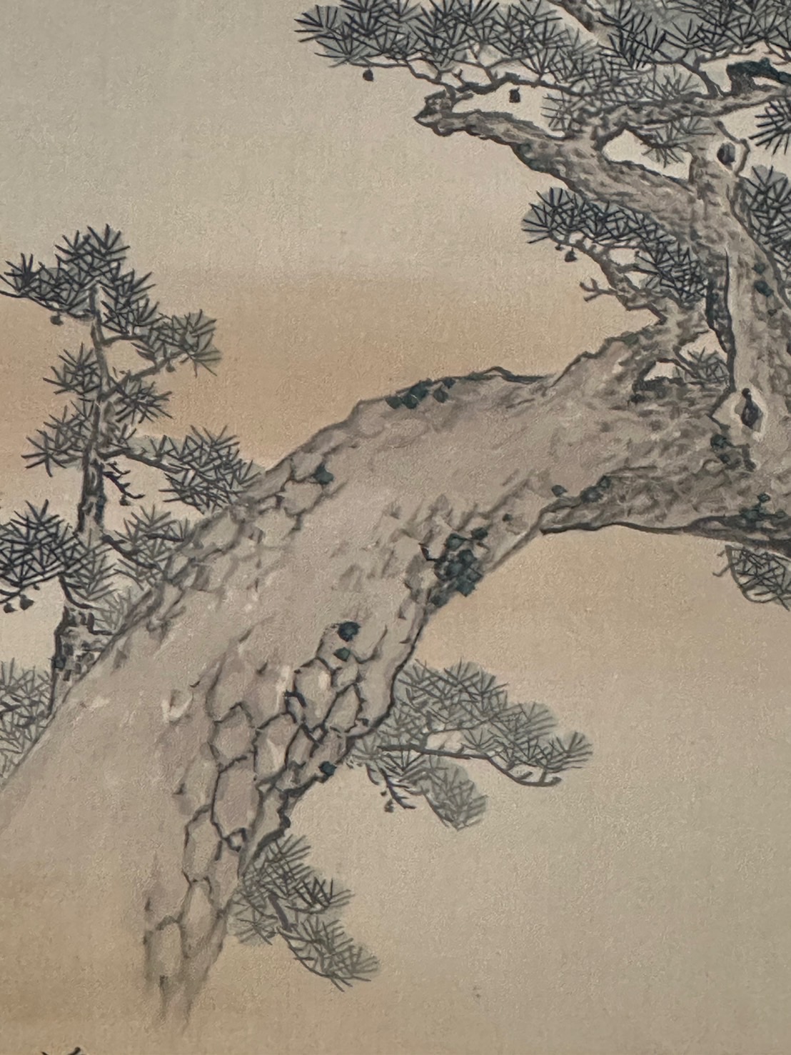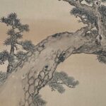 The combination of the pine tree and cranes is called “Shokakuchoshun,” an auspicious painting title, and is meant to celebrate the couple’s longevity and immortality. Focusing on the representation of the pine tree, the artist skillfully depicted the different textures of the tree, such as the rugged, cracked bark and needle-sharp leaves. The strong branches of the pine trees and the soft colors used throughout the painting are in pleasant harmony, creating a picture filled with a calm vitality.