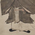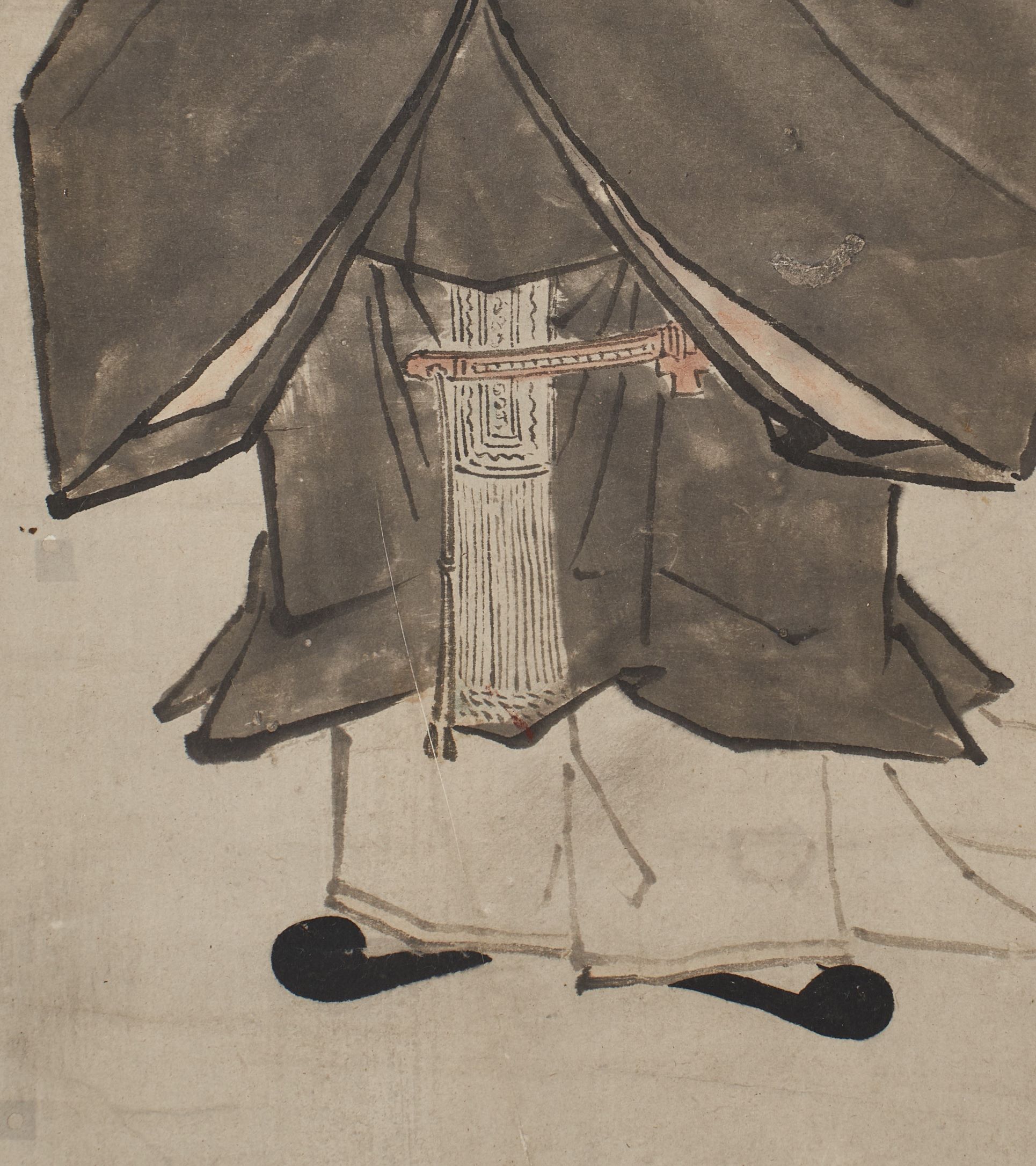 The expression on Michizane’s face as he looks up at the plum tree, “This is the last time I will ever see you,” is so frowned upon that it seems as if he might start crying at any moment. The artist’s attention to detail can be seen in the fine, even lines used to draw the beard, eyebrows, and hair. On the other hand, the lines on the robe are strong and weak, in contrast to the lines on the face.