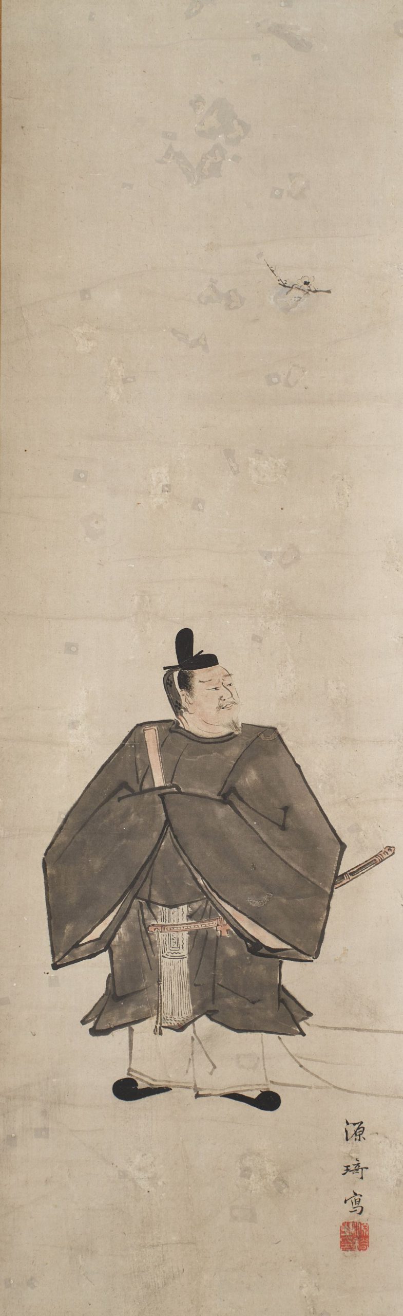 This is a poem that Michizane composed looking up at the plum tree in his residence when he was transferred to Dazaifu. This work depicts that very scene.