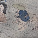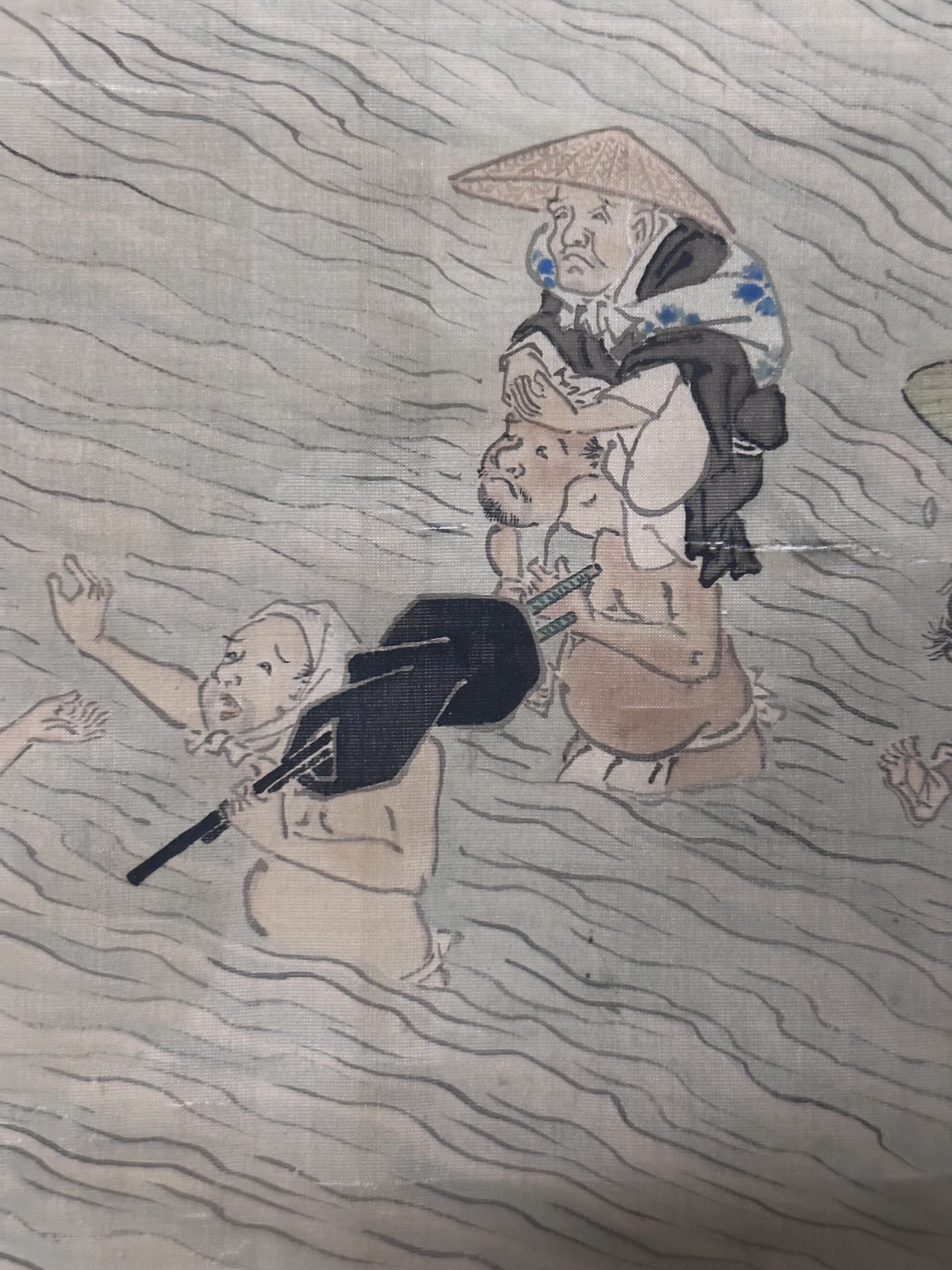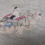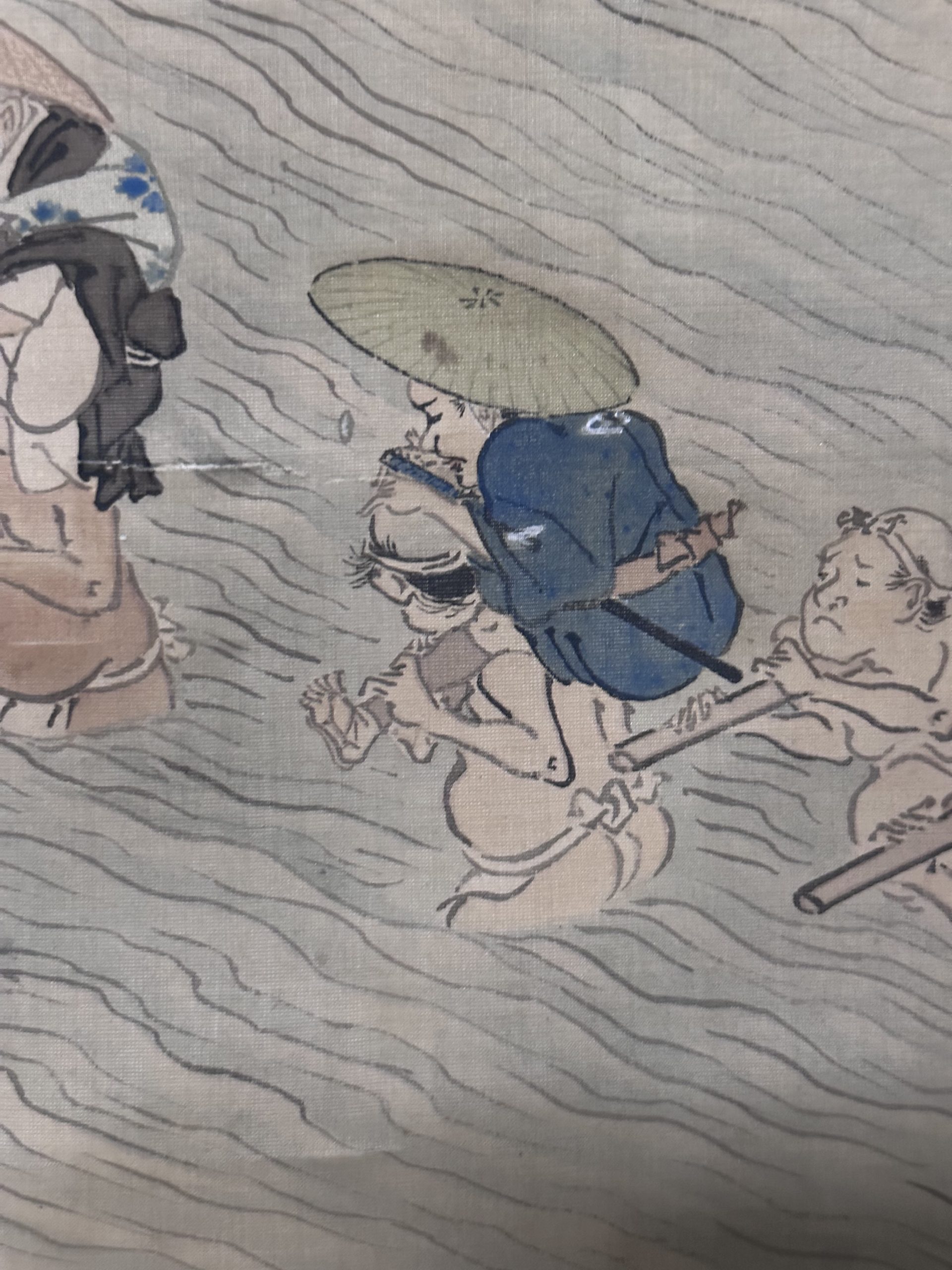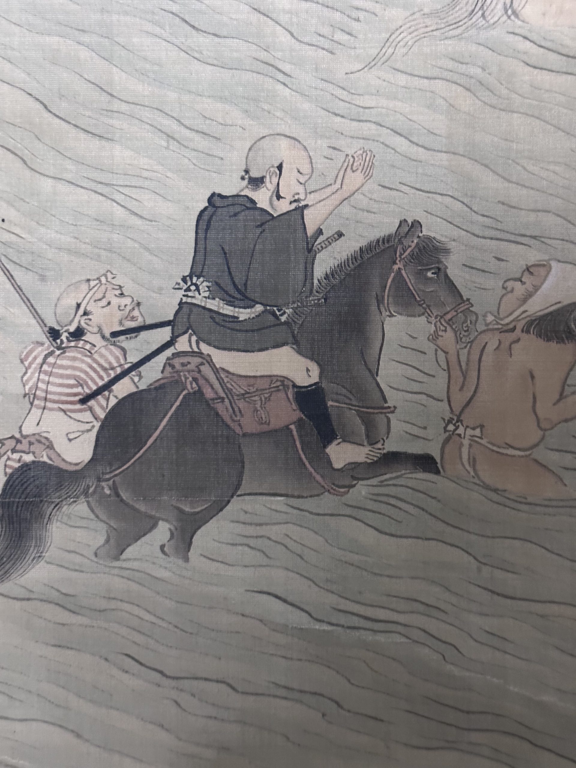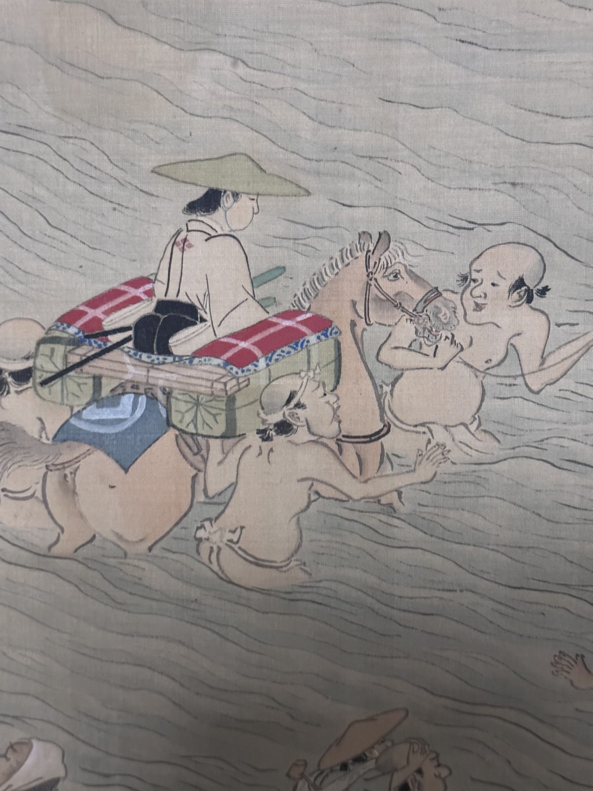 Two more figures are crossing the river on horseback. This was called “horse crossing,” and only persons of the samurai class and above were allowed to cross the river.