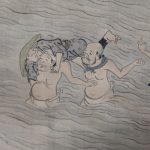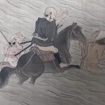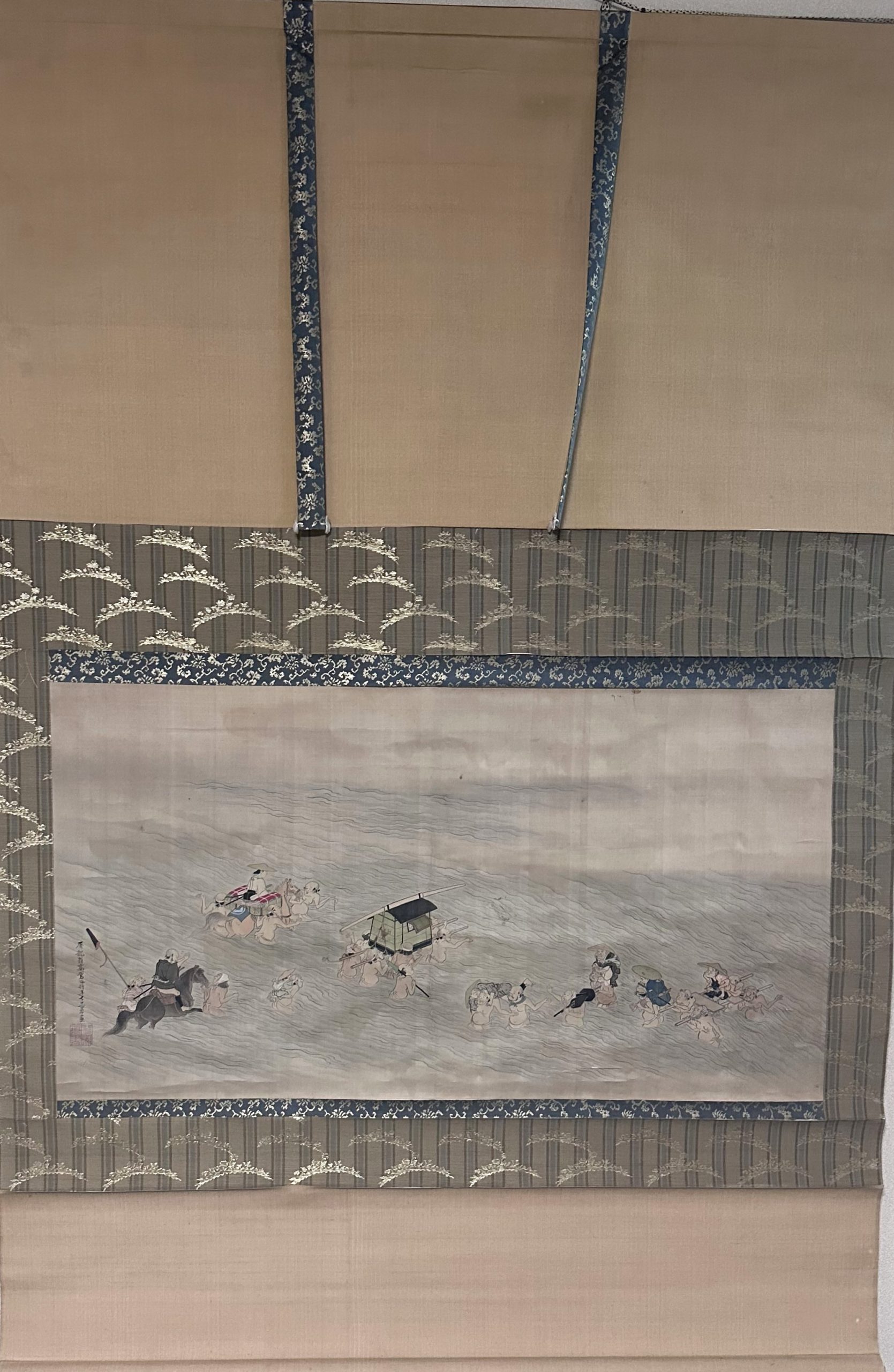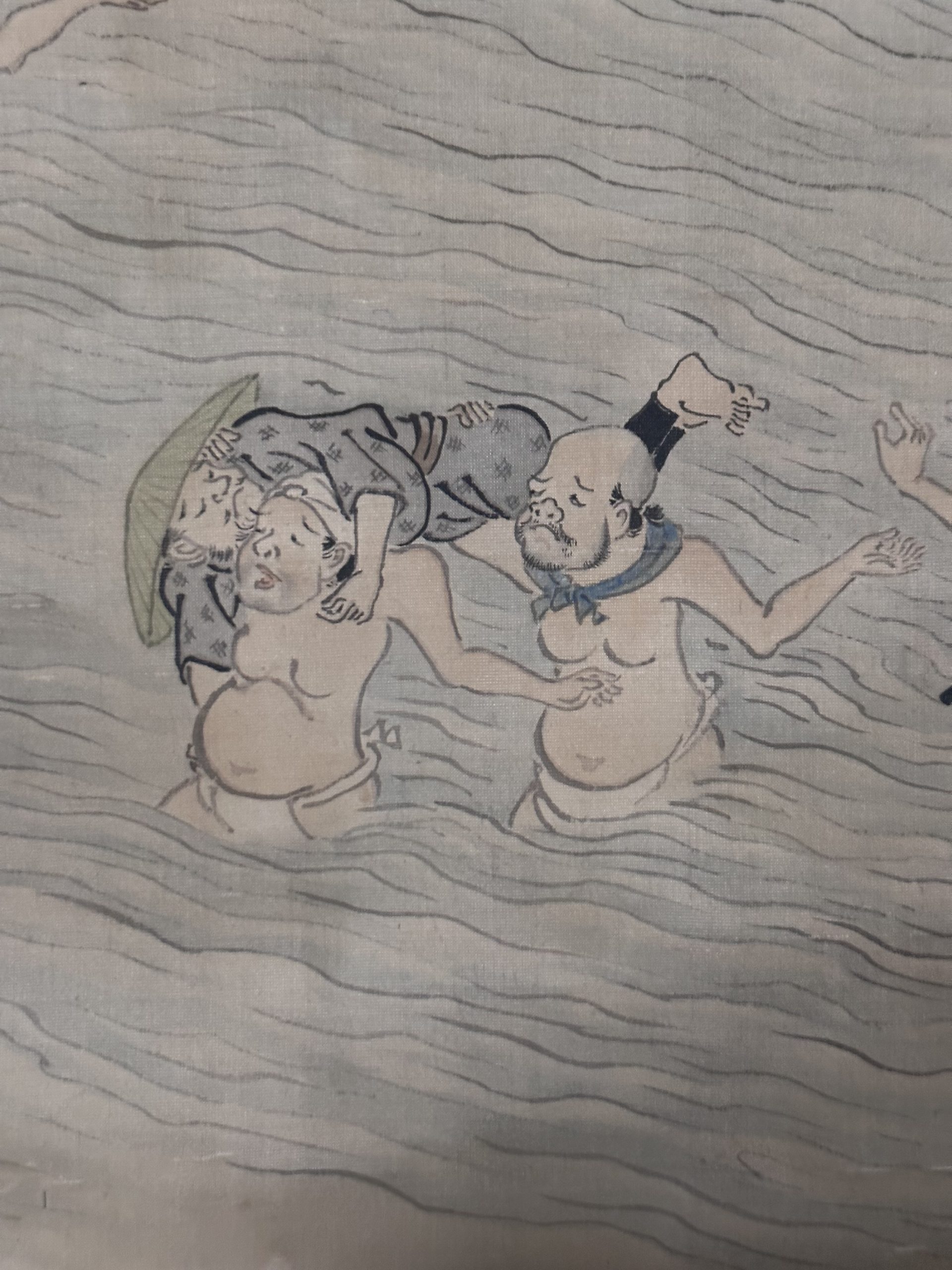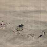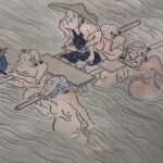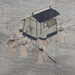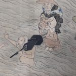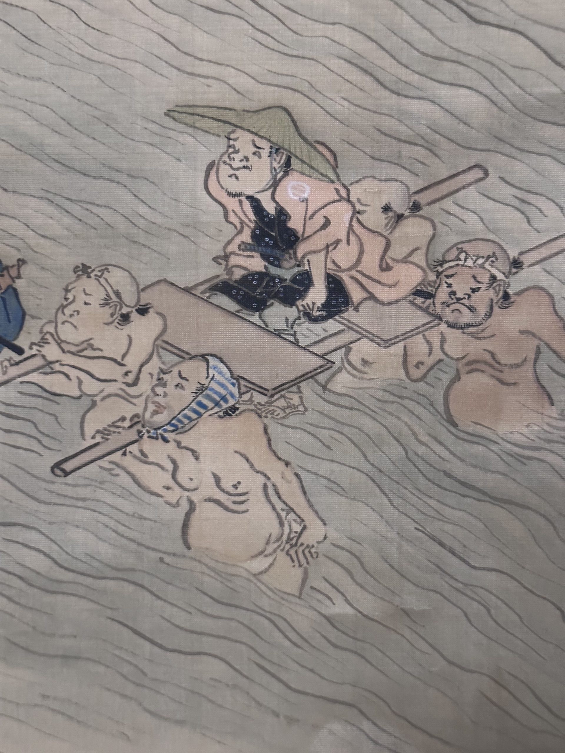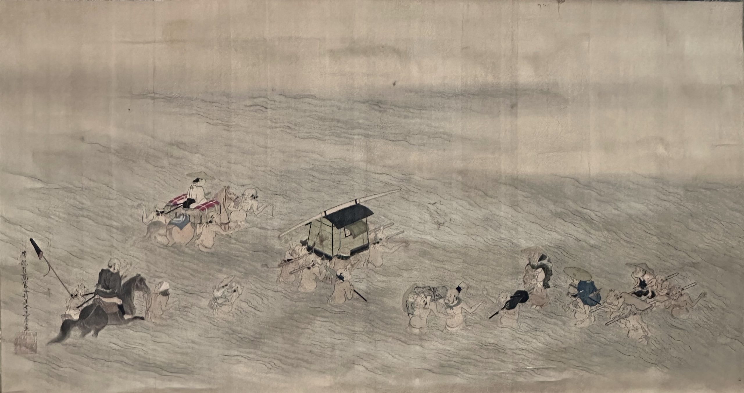 Two more figures are crossing the river on horseback. This was called “horse crossing,” and only persons of the samurai class and above were allowed to cross the river.