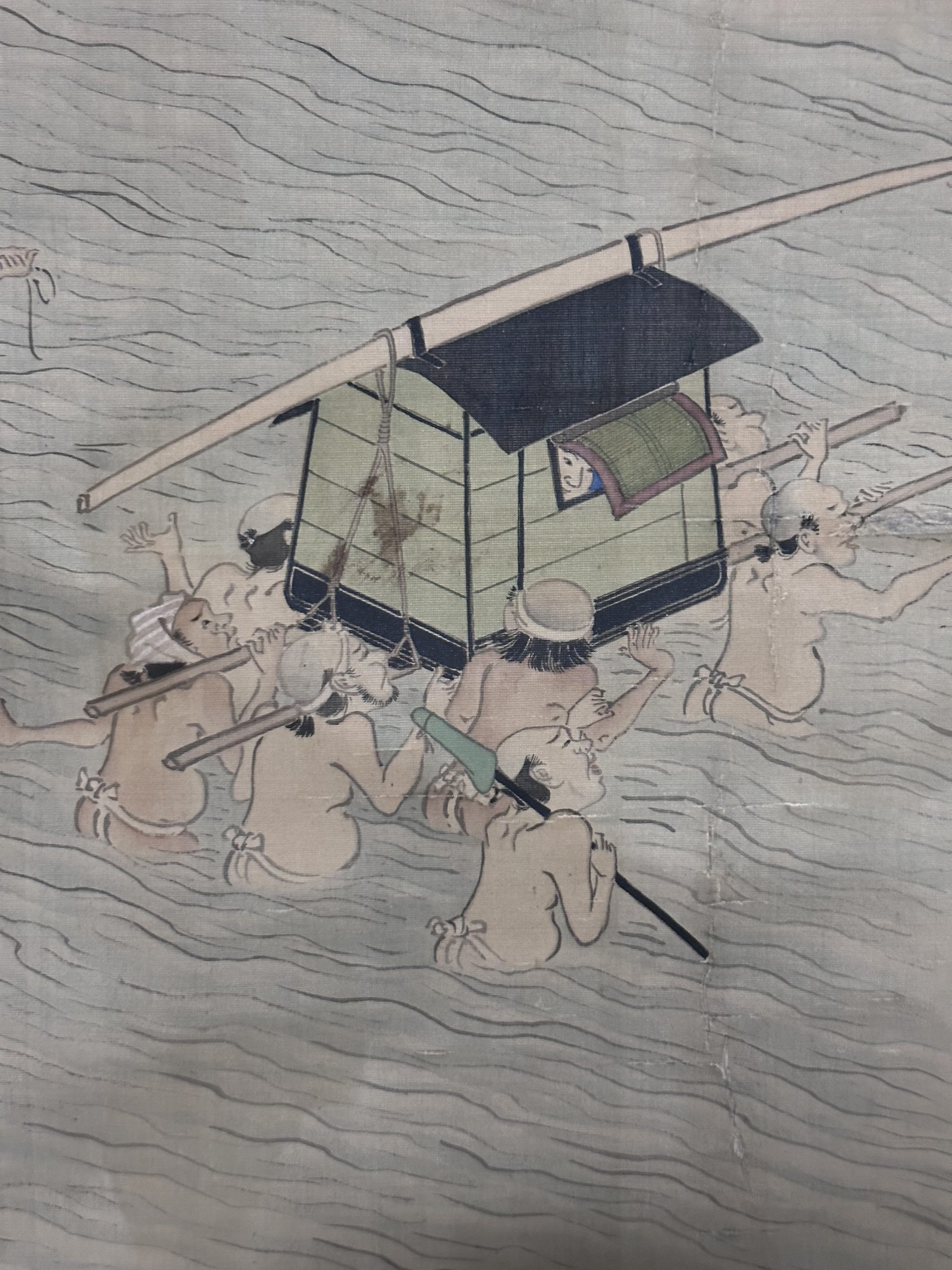 Passing them is a large palanquin being carried by six men. Inside the palanquin is a person of high rank, probably a feudal lord or a nobleman. The man peeks out from the blind and seems to be asking, “Have they arrived yet? or something like that.
