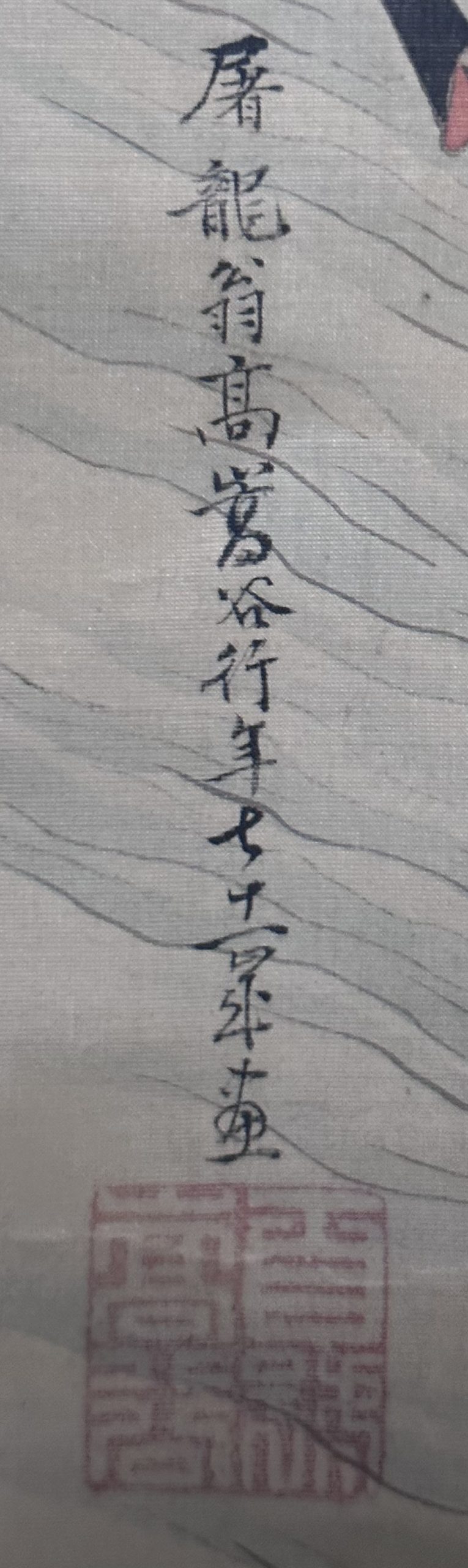 After his middle age, he broke new ground in warrior paintings, and gained popularity when he painted “Gen sanmi Yorimasa Nightmare Bird Extermination” for the Kannondo Hall of Sensoji Temple.