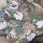 However, the charm of this work is that it is not a mere copy of Eitoku’s work. Unlike Eitoku’s muscular and sharp-eyed chinese lions, which depicted by Tatsunobu have a gentle expression and graceful appearance. The spiral-shaped mane, which in Eitoku’s work is expressed with the force of a flame, is expressed with a soft, habitual hair-like texture.