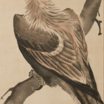 A hawk perched on a pine branch, its sharp gaze fixed behind it, is depicted. The hawk’s rendering is exceptionally detailed, with each part—from head to neck, torso, and talons—meticulously rendered. Particularly, the fluffy neck feathers showcase the masterful feather-rendering technique of the artist.