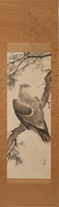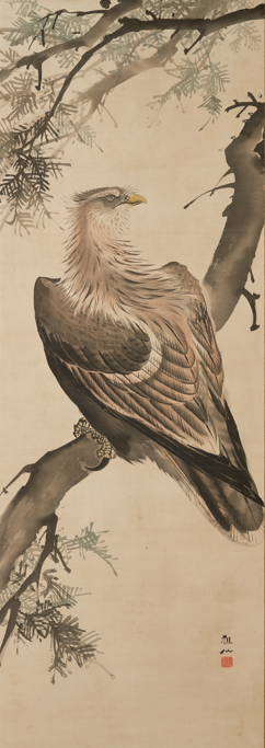 In contrast, the pine tree is rendered with simplified, vigorous brushstrokes. This juxtaposition with the meticulously detailed hawk lends the work a complex charm. The skillful use of varying ink tones to express the overlapping branches and leaves is also masterful.